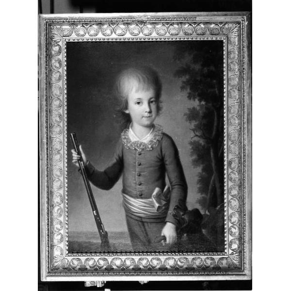 Ritratto del piccolo Ferdinando a 3/4 di figura con collettino di merletto bianco, fusciacca in vita, fucile nella mano destra ed un piccolo cane, di cui tiene la zampa con la sinistra. Sondo paesistico.. Personaggi: Ferdinando. Oggetti: fucile. Animali: cane