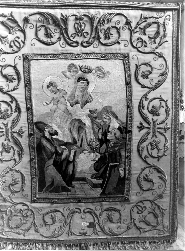Personaggi: Madonna; Gesù Bambino; San Bernardino da Siena; Santi. Attributi: (San Bernardino da Siena) monogramma di Cristo