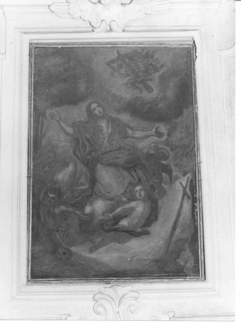 dipinto. Personaggi: Santa Maria Maddalena. Figure: angeli. Attributi: (Santa Maria Maddalena) vaso. Attributi: (Santa Maria Maddalena) teschio. Attributi: (Santa Maria Maddalena) libro. Attributi: (Santa Maria Maddalena) croce