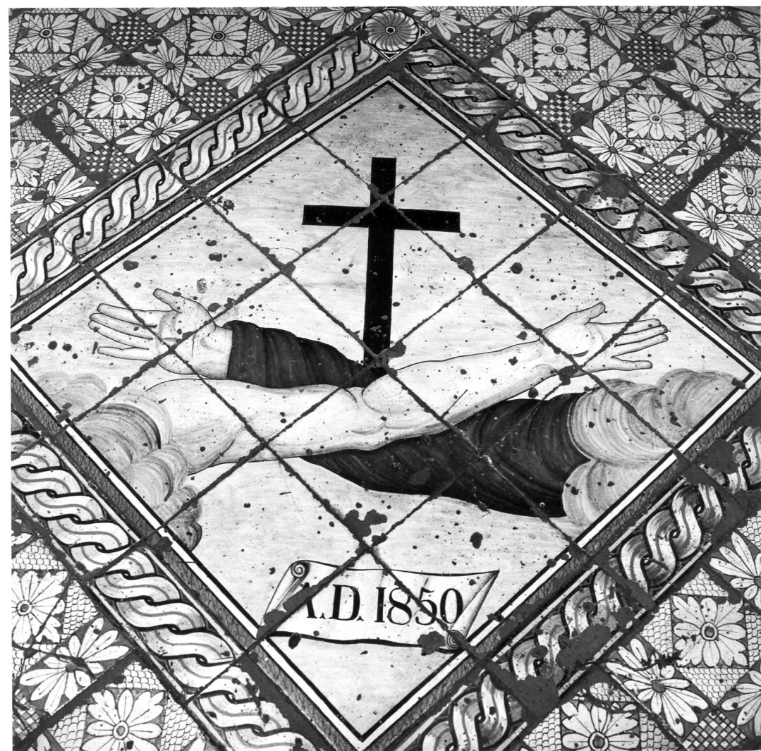 Pavimento con al centro emblema dell'Ordine francescano e motivi decorativi geometrici e vegetali stilizzati.
