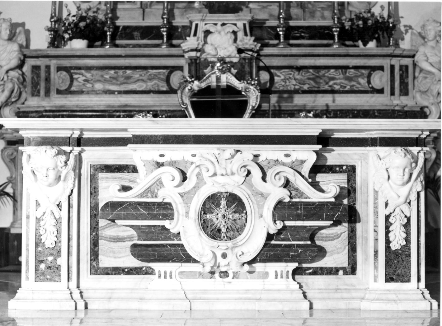 mensa d'altare con cherubini e motivi decorativi a volute e croce centrale