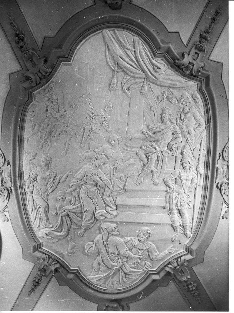 Il rilievo raffigura Ester alla presenza di Assuero. Il re persiano è seduto sul trono alla presenza della sua corte. Ester è inginocchiata, vestita di splendide vesti ed accompagnata dalle sue dame. Intorno al rilievo c'è una grande cornice, sempre di stucco, con ricci e volute.. Personaggi: Ester; Assuero. Figure: dame; soldati. Figure maschili