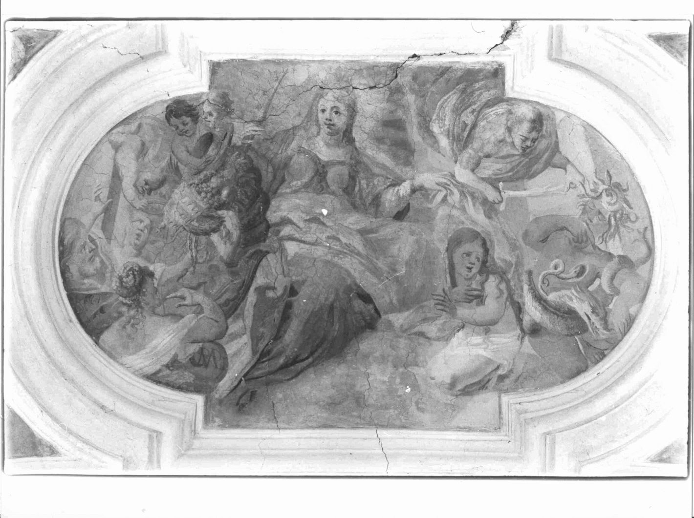 Allegoria: al centro è la Fede che difende sotto il suo manto l'anima del male. Esso è rarappresentato con il simbolo del serpente che avvolge nelle sue spire l'uomo: Adamo ha il capo incorniciato da serpentelli ed è scacciato dall'Angelo che impugna la spada fiammeggiante. Sulla destra, da una cornucopia la Fede elargisce ai fedeli i suoi doni.. Figure: Fede; angelo. Allegorie-simboli: male. Personaggi: Adamo