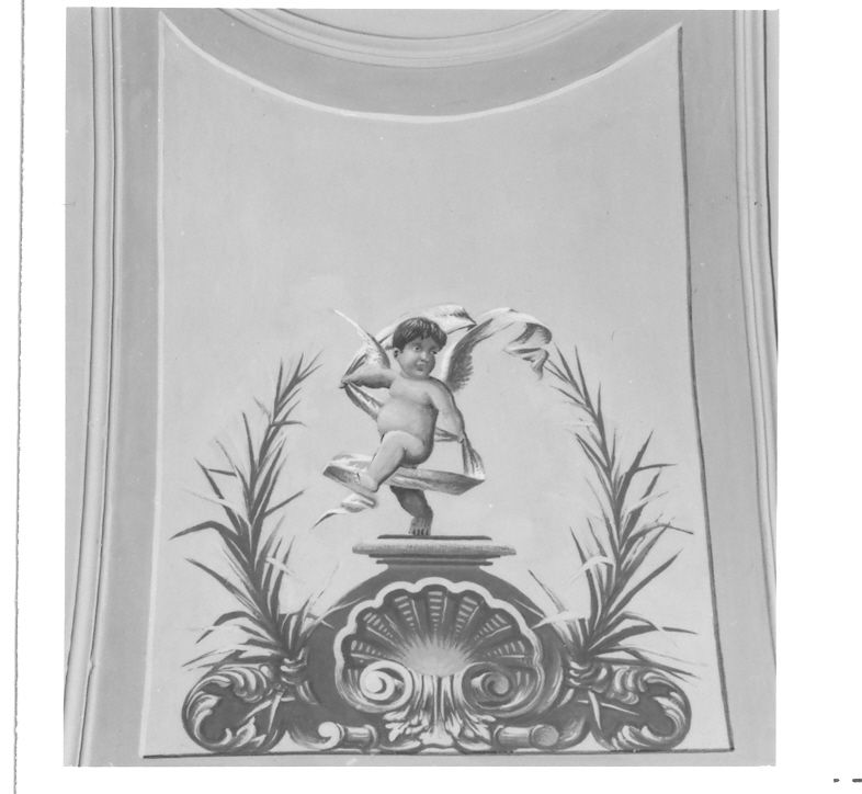 L'affresco raffigura un putto danzante su una base con conchiglia e foglie.. Figure: putto