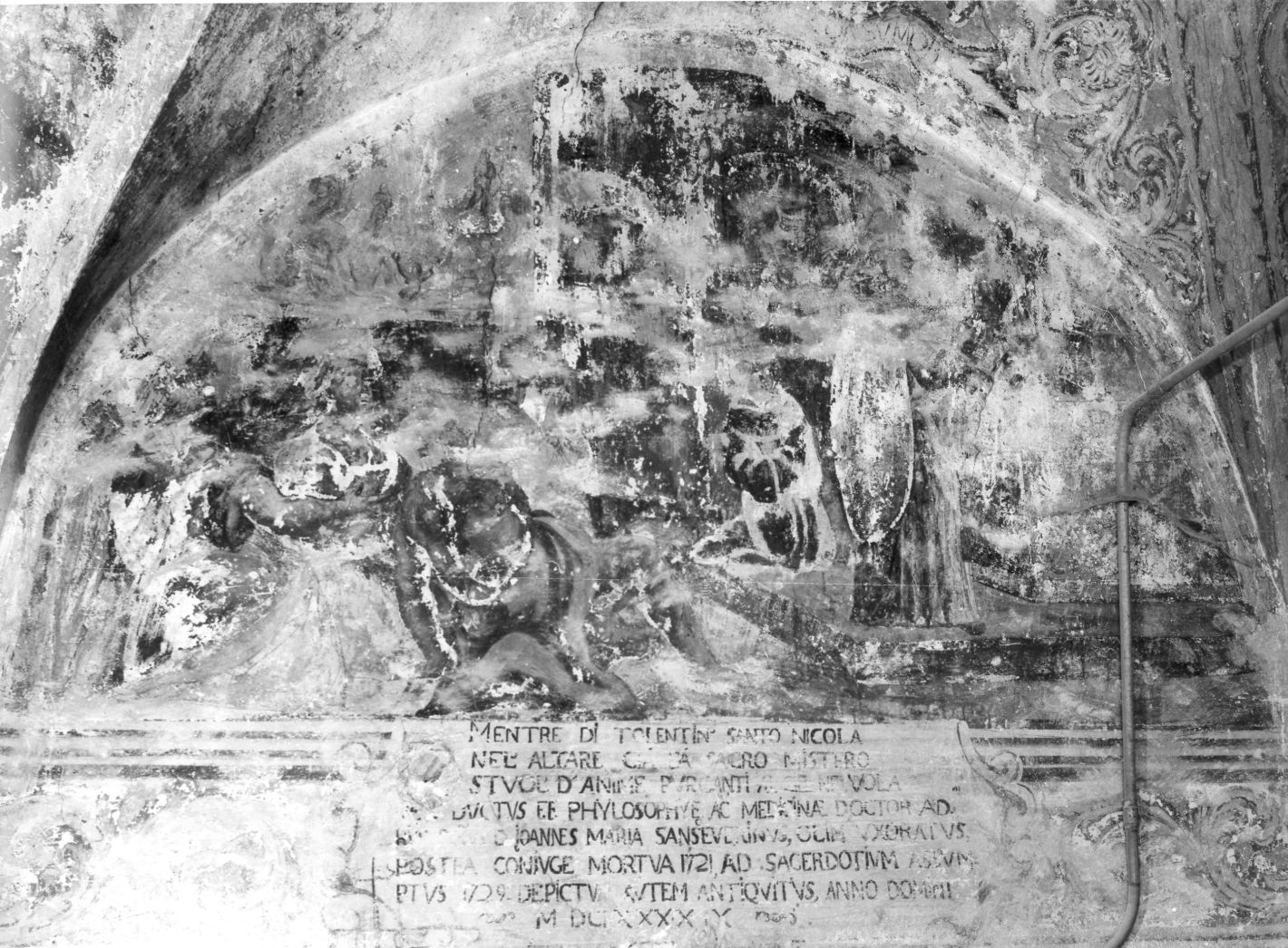 La decorazione pittorica comprende quattro lunette a stento leggibili: la prima rappresenta San Nicola da Tolentino, a destra, che celebra la messa, a sinistra figure astanti ed in alto anime in volo; la seconda rappresenta San Nicola al centro, inginocchiato in preghiera, in alto angeli musicanti; nella terza vi sono due figure sedute accanto ad una tavola imbandita; nella quarta Gesù nelle vesti di un bambino con un pane in mano, a sinistra, appare al Santo nell'angolo destro un cane accucciato. Nelle volte che corrispondono alle lunette era dipinta una decorazione a motivi fogliacei con fiori e ninfe quasi completamente scomparsa.