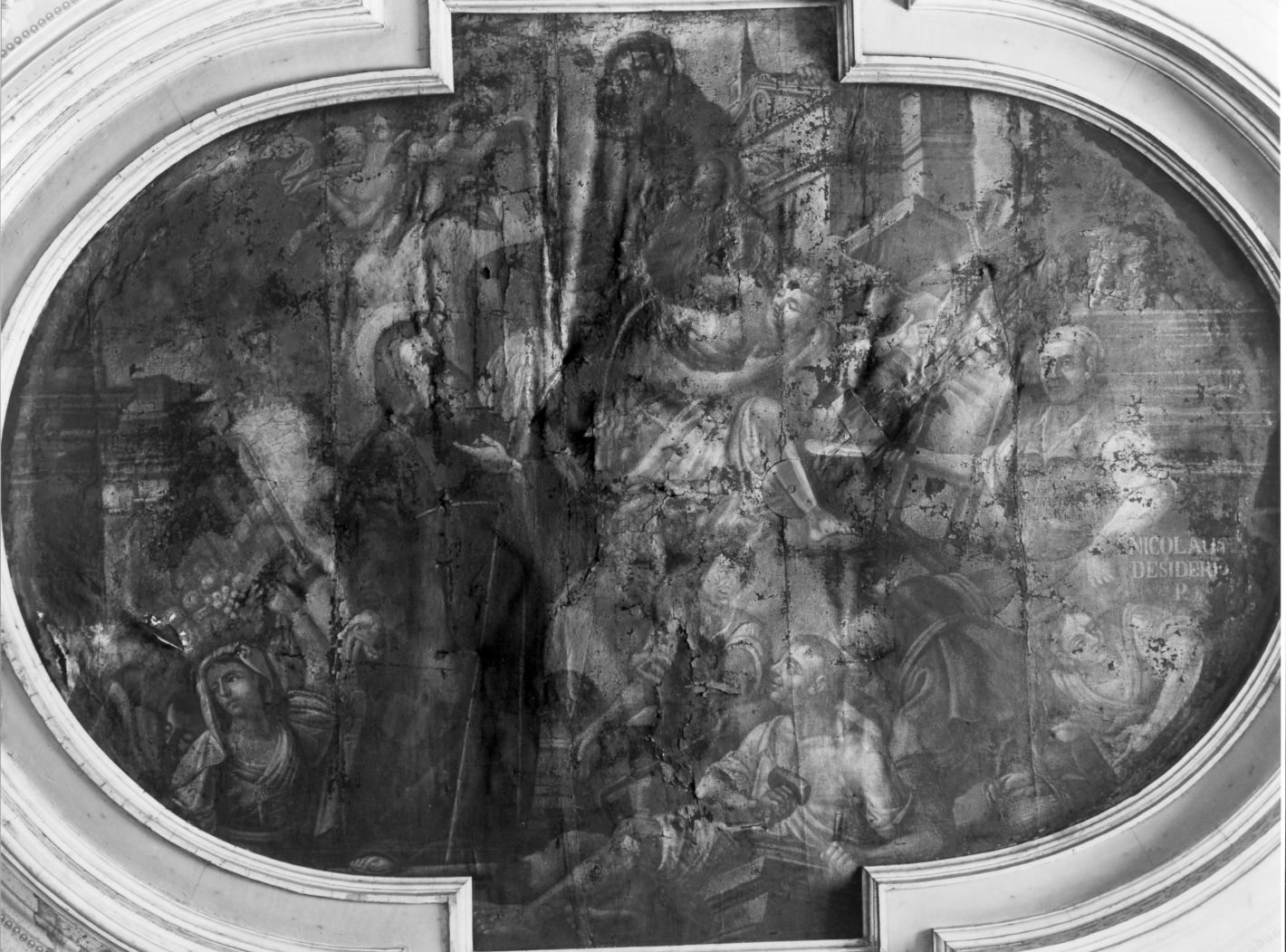 Sulla sinistra il santo, e in basso una donna che porta sulla testa un cesto con la frutta. Seduti a terra, in basso a destra, degli uomini inchiodano. In alto a sinistra due angeli e San Francesco d'Assisi e a destra un prospetto di chiesa. Il dipinto è all'interno di una cornice mistilinea.. Personaggi: San Francesco d'Assisi; San Francesco di Paola. Figure: angeli. Figure maschili