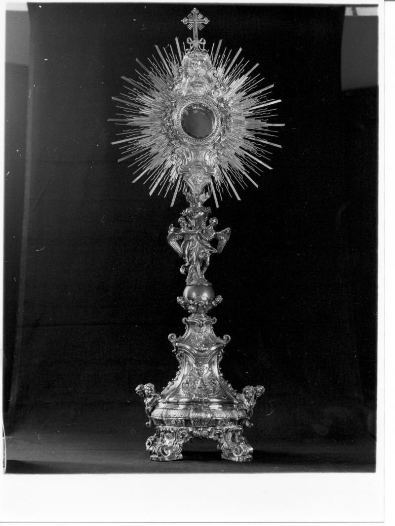 L'ostensorio è decorato con tralci di vite in argento dorato; è sorretto da due angeli piumati al centro dei quali è un cuore d'oro ed una corona di spine. La base è riccamente lavorata e presenta motivi frequenti nel decorativismo barocco, quali conchiglie, volute, gruppi di angioletti.. Simboli. Figure: angeli
