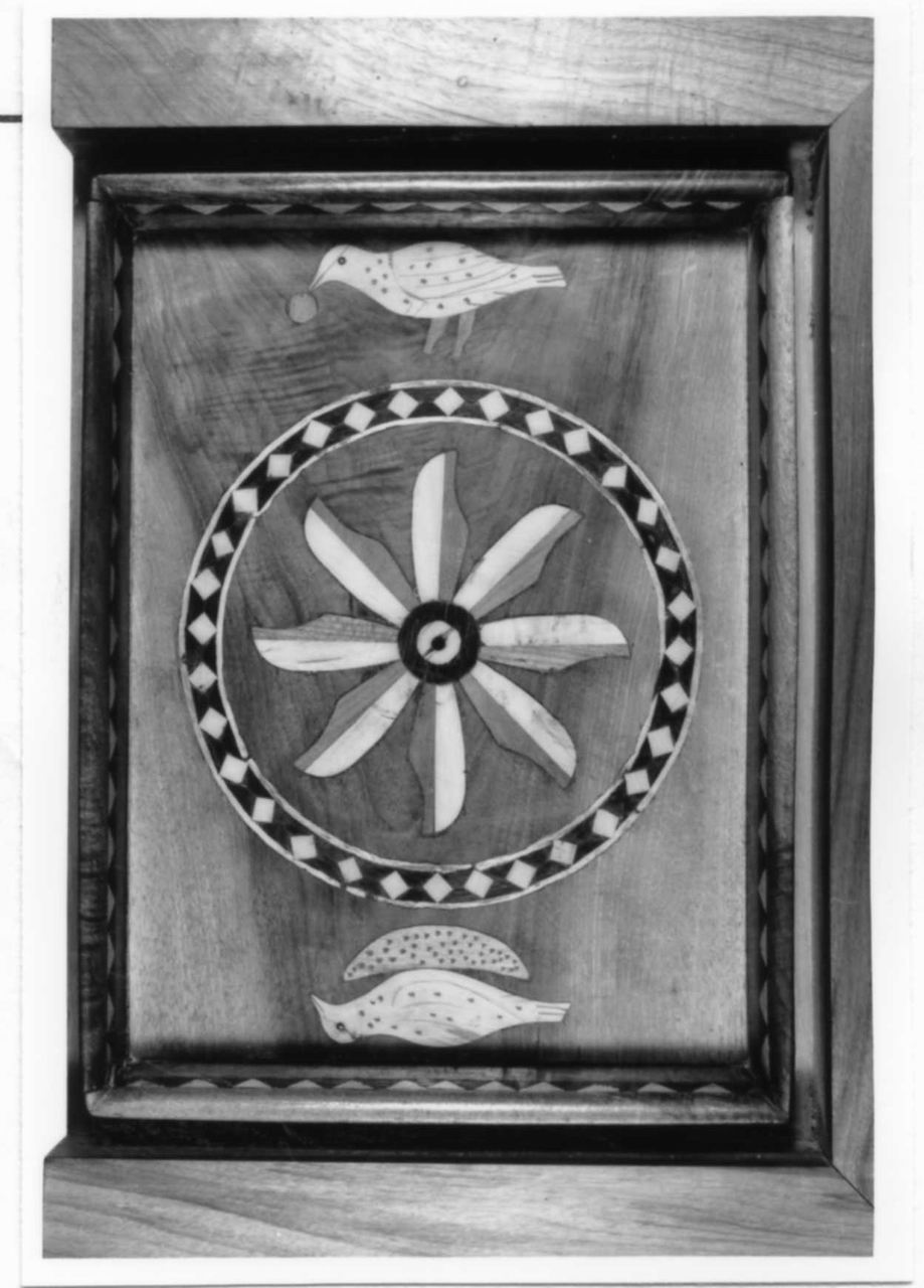 Vassoio rettangolare con disegno geometrico e due uccelli intarsiati.. Decorazioni. Animali: uccelli