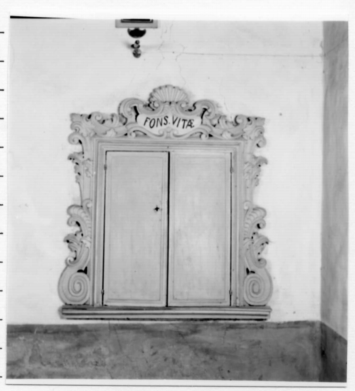 Nicchia murale chiusa da doppi sportelli rettangolari, lisci. La cornice di contorno presenta motivi a volute e fogliati. Attualmente dipinta nei colori azzurro e grigio.. Vegetali: volute fogliate