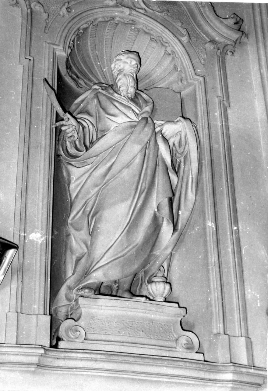 Statua a tutto tondo, in terracotta scialbata di bianco. Abramo ampiamente panneggiato tiene nelle mani un coltello ed un libro.. Personaggi: Abramo. Oggetti: coltello; libro