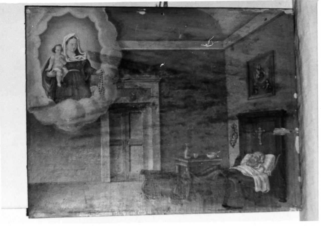 La Madonna del Rosario in vesti rosse e azzurre compare ad un infermo giacente su un letto dalle coperte verdi. Le pareti della stanza sono grigie e i riquadri della porta azzurri. Nel verso della tavoletta èincollato un foglietto con la scritta: "A. M. D. G.per prodigiosa apparizione e grazia...ricevuta da un confratello del SS.mo Rosario infermo, avvenuta in Montecchio alli 3 Agosto dell'anno 1859. vedi i documenti della med. ma confraternita".. Personaggi: Madonna del Rosario. Figure maschili: infermo. Interno: stanza da letto