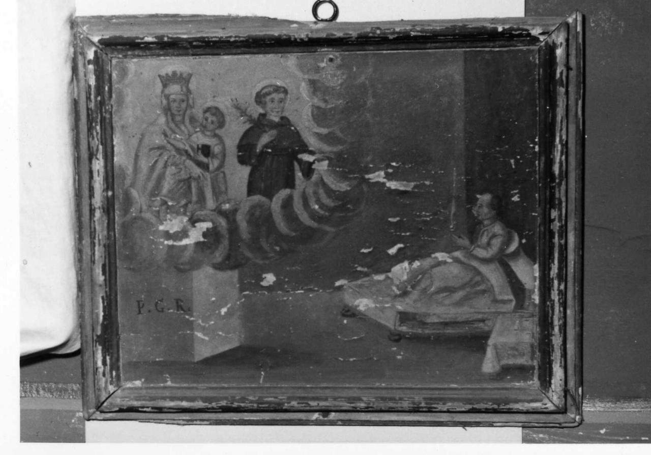 In una stanza dalle pareti grigiastre sta un infermo in preghiera, seduto su un letto dalle coperte verdi lumeggiate di giallo; a sinistra, in alto, sul fondo dorato delle nubi, sono visibili S. Francesco e la Madonna con il Bambino. In cornice di legno dipinta di verde e di rosa.. Personaggi: Madonna; Gesù Bambino; San Francesco. Figure maschili: infermo. Interno: camera da letto