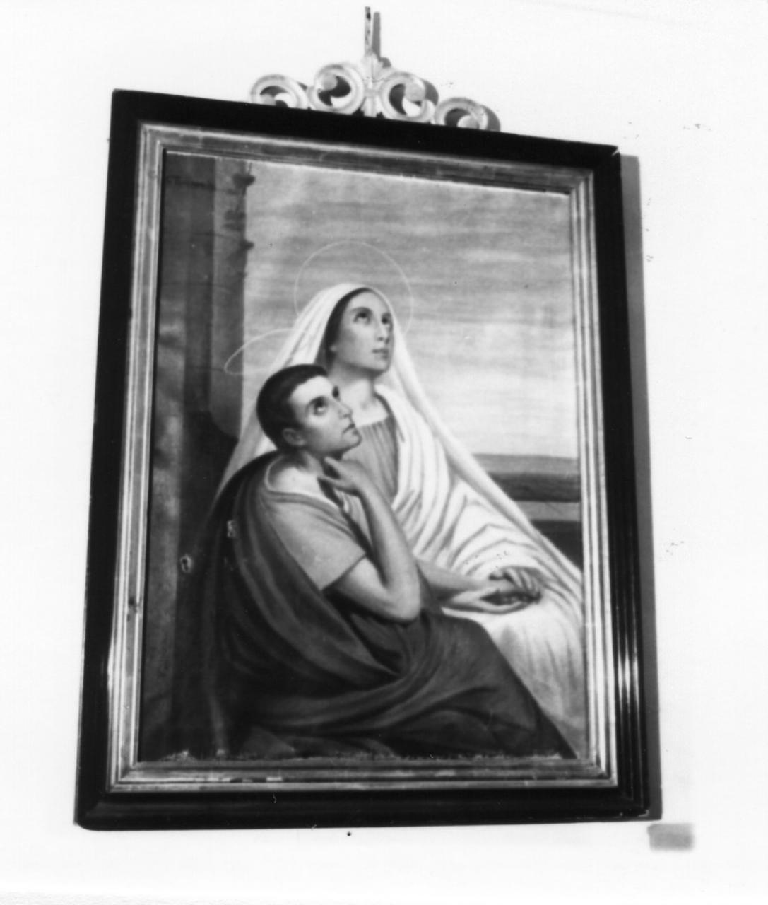 Sant'Agostino, in veste rossa e manto azzurro, è seduto e contempla il cielo, la mano in quella della madre Santa Monica, che ha tunica grigia e manto bianco, che le copre il capo. Sulla sinistra, pilastri e, oltre il davanzale, paesaggio con fondo di cielo rosato e azzurro. Cornice di legno dipinto in nero e oro provvista di cimasa ornata a volute.. Personaggi: Sant'Agostino; Santa Monica