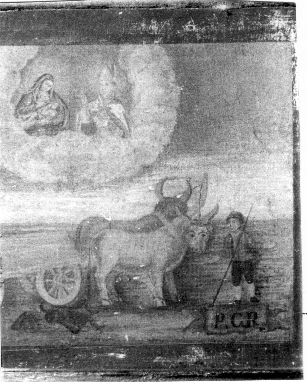Scena all'aperto, tra i campi, in un paesaggio stilizzato con orizzonte spoglio. Un uomo viene travolto da un pesante carro grigio, agricolo, trainato da due buoi marroni e il contadino assiste alla scena. Sulle nubi la Madonna appare insieme ad un santo vescovo. Finta cornice a listatura marrone.. Personaggi: Madonna. Mezzi di trasporto: carro. Figure maschili: carrettiere; contadino