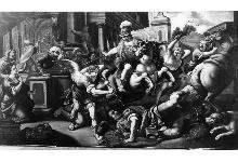 Ai piedi dell'alta scalinata del tempio, tenendo il cavallo alzato sulle zampe posteriori, un cavaliere si precipita su Eliodoro ormai caduto sotto i colpi di sferza di due angeli, mentre tutto intorno è un "fuggi fuggi" di soldati e di fedeli.