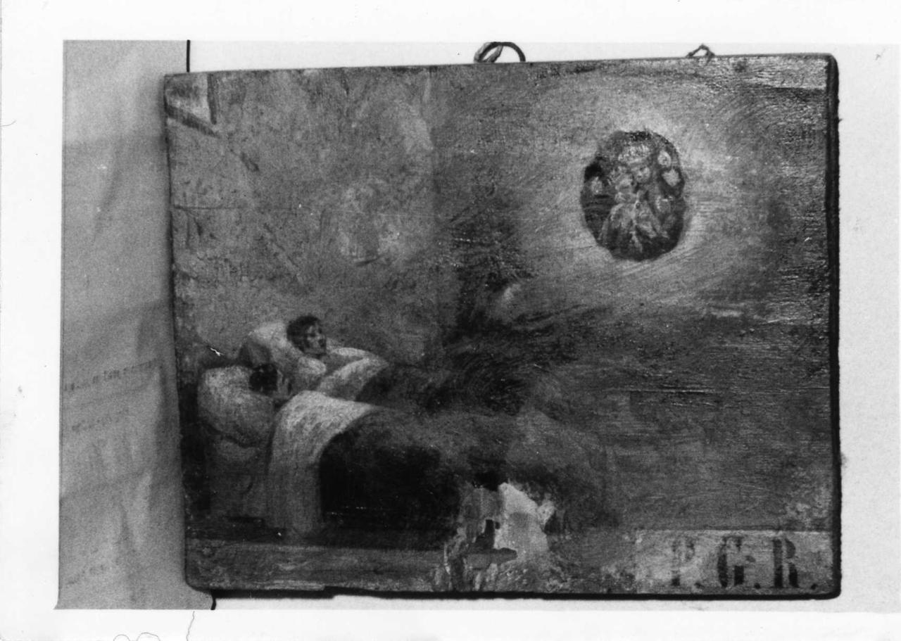 Interno di stanza. Due uomini giacciono ammalati su letti con coperte marroni. Sulle nubi è l'immagine della Madonna con il Bambino.. Personaggi: Madonna; Gesù Bambino. Figure: uomini. Oggetti: letti