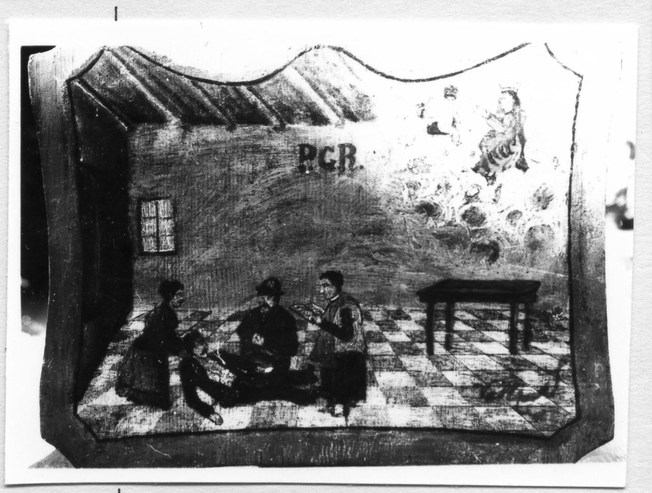 Tavoletta a contorno sagomato in cornice piatta. Interno di stanza dal pavimento a quadroni. Un uomo è riverso, sostenuto da una donna, assiste un altro uomo e un prete intento alla preghiera. Sulle nubi l'immagine della Madonna della Ghiara.. Personaggi: Madonna della Ghiara; Gesù Bambino; Uomini; Prete. Interno
