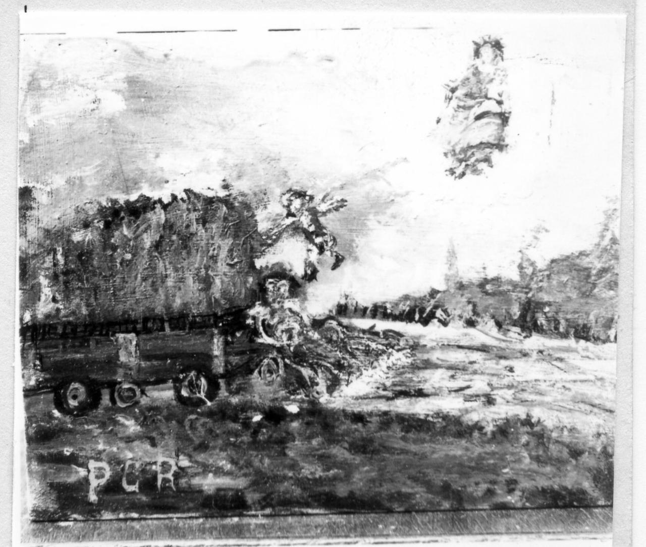 Paesaggio campestre con colline. Su una strada è un carro carico di fieno e un uomo precipita a terra. Sulle nubi l'immagine della Madonna col Bambino.. Personaggi: Madonna; Gesù Bambino; Uomo. Paesaggi. Oggetti: Carro
