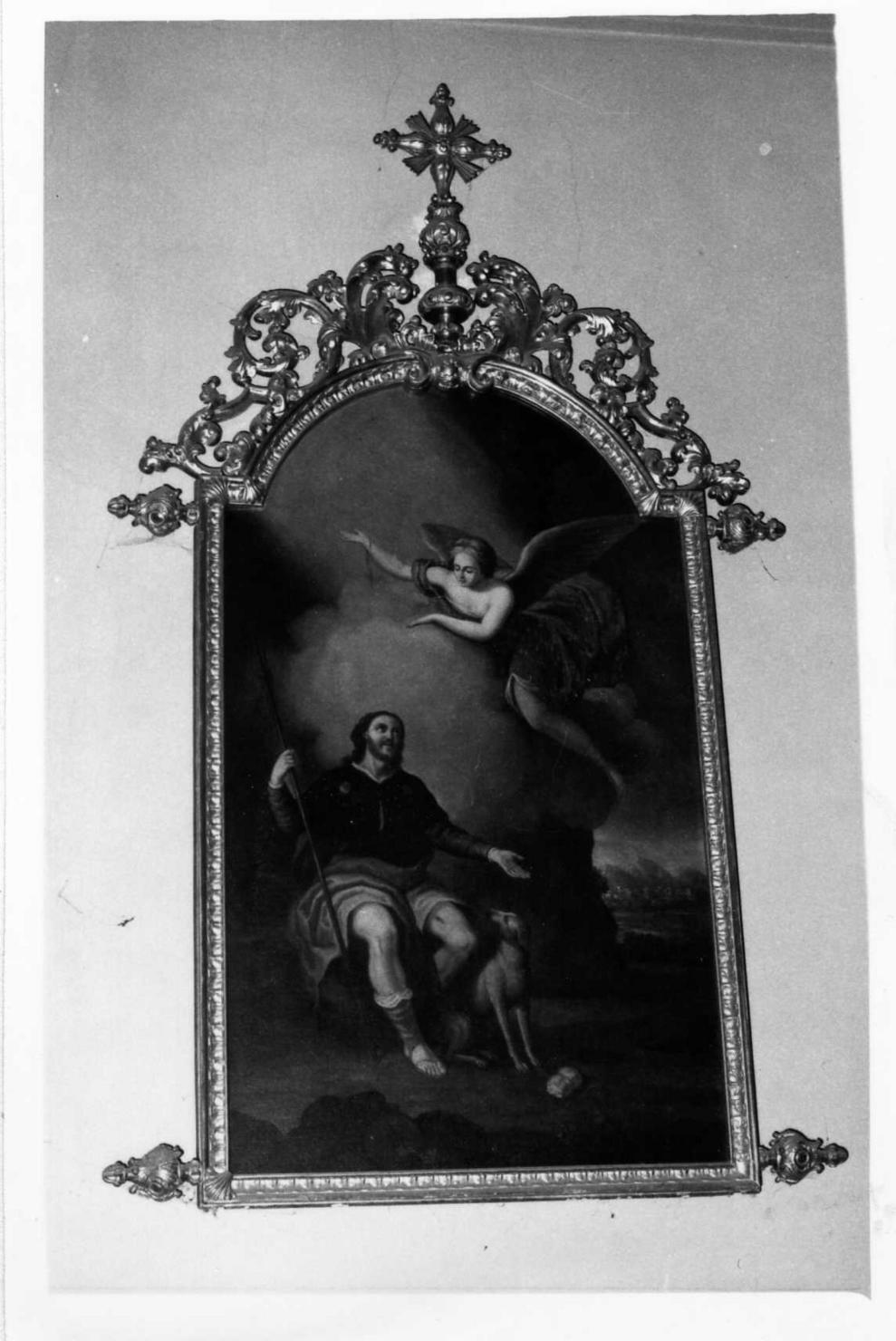 Il santo è seduto, in veste gialla, grigia, con mantellina scura; gli appare un angelo vestito di viola illuminato da luce dorata. Grande cornice in legno intagliato e dorato con ampia cimasa traforata.. Personaggi: San Rocco