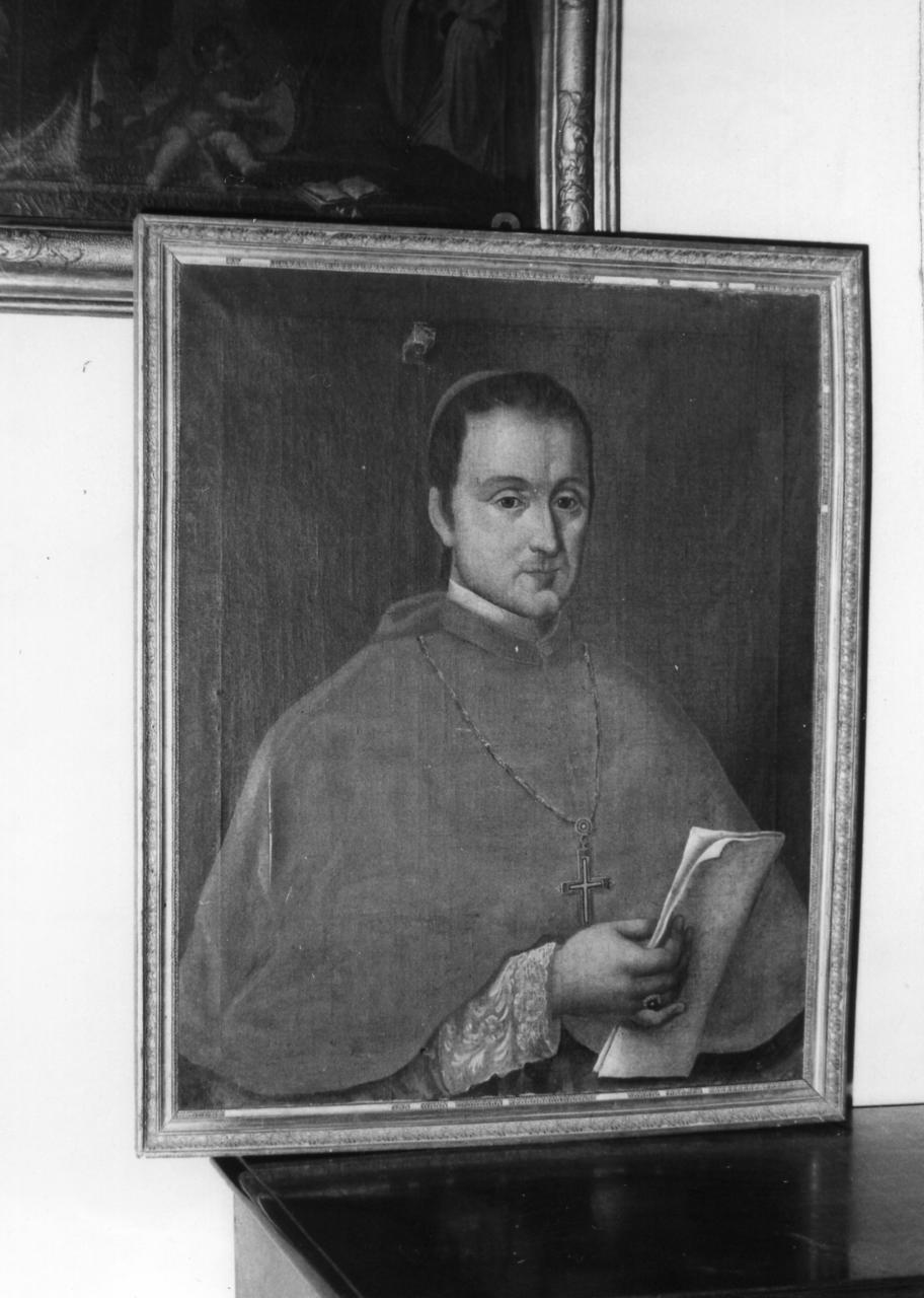 Mezza figura di prelato con lettera piegata nella mano. Ha mozzetta rossa e camice a pizzi bianchi su fondo rosso. Fondo rosato in sfumato. Cornice di legno dorato.. Ritratti: Cardinale Antonelli