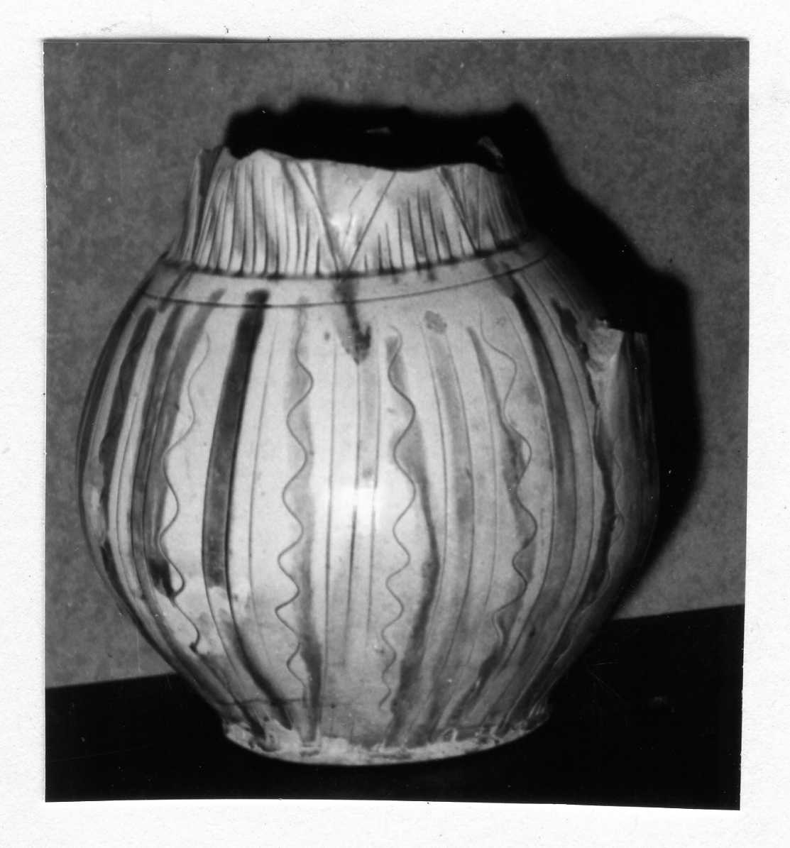 Sul corpo vagamente ovale bande verticali diritte ed ondulate, alternate, sul collo motivo stilizzato dell'aureola fiammeggiante. Il decoro è eseguito a graffito. Colori ferraccia e ramina.. Decorazioni: motivi geometrici