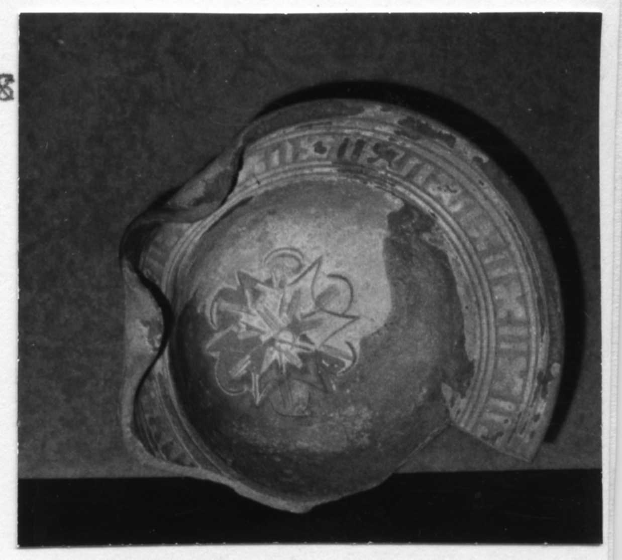 La tesa, foggiata a versatoio, reca la decorazione del fiore gotico stilizzato di derivazione quattrocentesca. Nel cavetto grande fiore in forma di stella esagonale. Eseguito a stecca e graffito. Scarto di fornace, privo di colori e vetrina.. Fiori