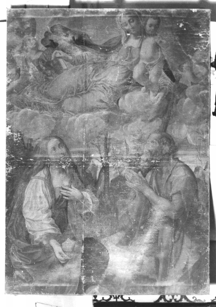 Dipinto raffigurante la Madonna con bambino, San Pellegrino e Maria Maddalena. Ambedue i Santi eremiti sono in ginocchio e adorano la Vergine, che presenta loro il bambino. Al centro si scorge una costruzione con una torre molto alta.. Personaggi: Madonna; Bambino; San Pellegrino; Maria Maddalena