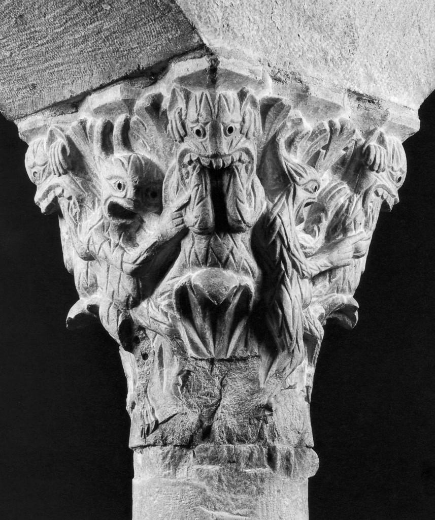 ogni faccia del capitello è occupata da un diavolo stante, raffigurato nella medesima posizione diagonale del demone precedente; il volto ghignante, l'indice puntato. Un fogliame scabro si alza dal collarino e sottolinea gli angoli.. Personaggi: diavoli