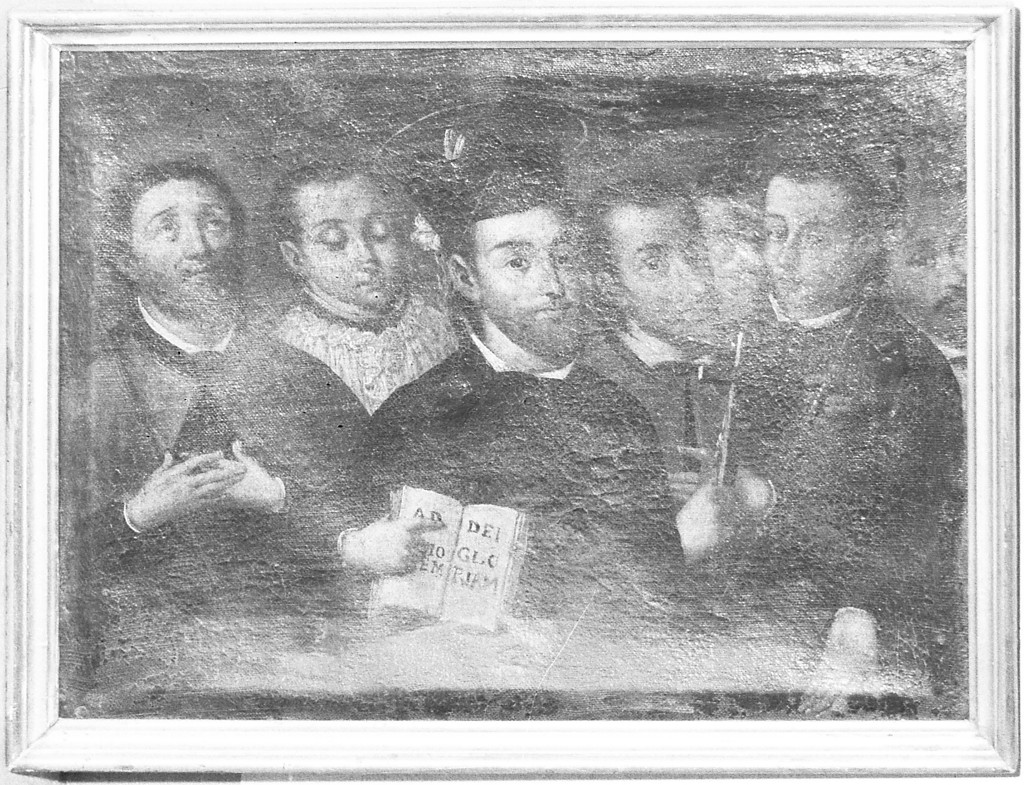 Gruppo a mezzo busto di sette figure di santi e beati, in abiti talari con mantelletta o cotta. Al centro è Sant'Ignazio col libro aperto, a sinistra San Stanislao Koska con bordone e mantelletta, e San Luigi Gonzaga con cotta a pizzi e giglio.. Personaggi: Sant'Ignazio di Loyola; San Stanislao Koska; San Luigi Gonzaga