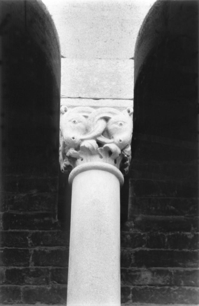 Il capitello presenta quattro protomi di ariete che poggiano su un giro di foglie mosse dal vento, secondo una tipologia già riscontrata nel vicino capitello destro del piano superiore del protiro di facciata. Le teste sono poste ad angolo e le corna compiono il consueto gioco di intrecci che caratterizza alcuni capitelli del prospetto.. Animali: ariete