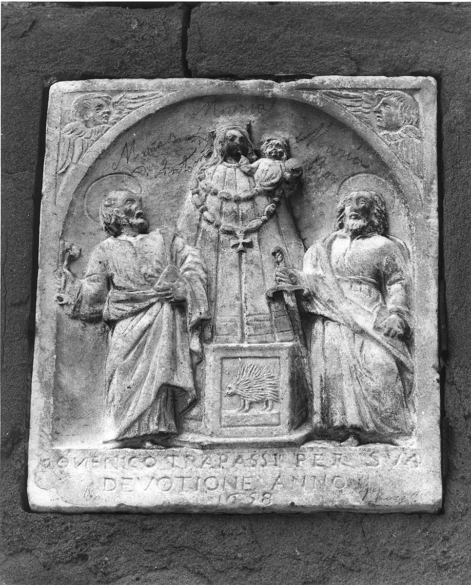 La formella a rilievo ripropone la tradizionale soluzione architettonica dell'absidiola appiattita come spazio prospettico interno allo specchio della lastra, qui più elaborato dal punto di vista decorativo per l'innesto di teste di cherubi a stiacciato, ai lati della nicchia. Al centro del gruppo è effigiata la Madonna lauretana, innalzata come una statua su un basamento poligonale decorato in fronte con l'immagine dell'istrice, allusiva all'originario committente, appartenente alla famiglia locale dei Ricci. Ai lati dell'esaedro, in posizione rigidamente simmetrica, si dispongono i Santi Pietro e Paolo, identificabili per i caratteristici attributi iconografici. L'iscrizione commemorativa appare riscolpita nella prima riga, che attribuisce l'erezione della maestà alla devozione di tal Domenico Trapassi. La formella è inserita entro una cornice quadrangolare in arenaria finemente orsata.