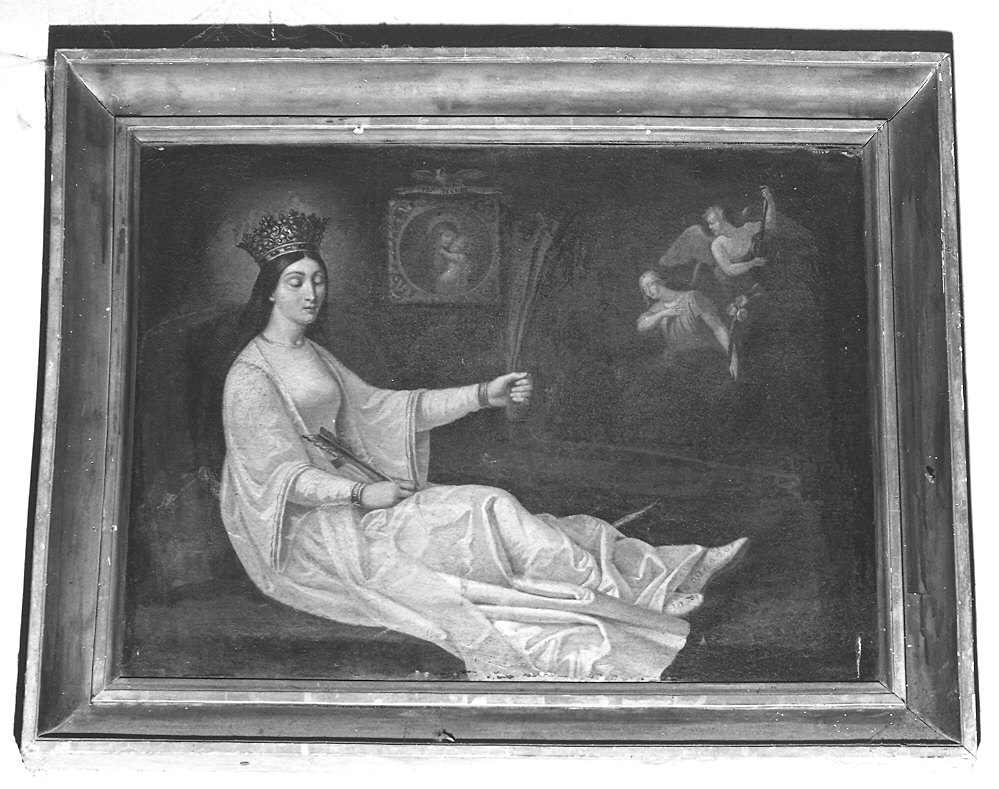 Personaggi: Sant'Orsola. Figure: angeli. Attributi: (Sant'Orsola) freccia; palma del martirio. Soggetti sacri: dipinto della Madonna con Bambino