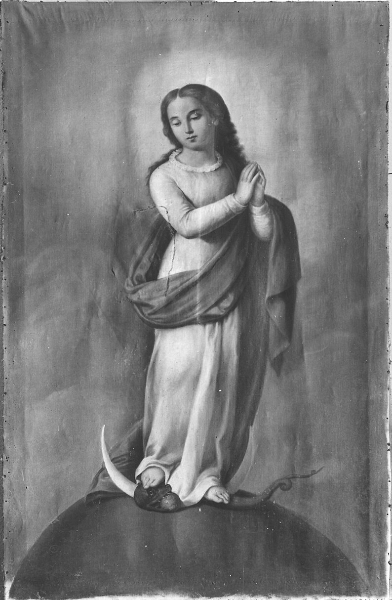Maria Bambina sta sulla mezzaluna ed il globo, ha le mani giunte in preghiera e schiaccia con i piedi il serpente. Gli abiti che indossa hanno le cromie tradizionali dell'iconografia ottocentesca: veste bianca e manto blu; il globo è verde e lo sfondo grigio-beige. La tela è priva di cornice.