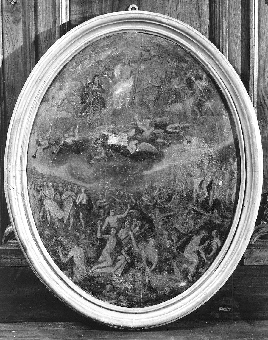 I quattro ovali rappresentano "Il trionfo della morte", "La Resurrezione dei morti ed il Giudizio", "Il Paradiso" e "L'Inferno". Al centro del primo è rappresentato il carro della morte, carico di cadaveri, trainato da due cavalli bianchi e guidato da uno scheletro con la falce. Altri cadaveri sono sparsi per tutto il paesaggio mentre in lontananza un vascello è sbattuto tra i flutti. In cielo vola il Tempo, barbuto, seminudo, con ali e falce; in primo piano è una "Vanitas" composta da libri, liuti, astrolabi ed una tavolozza con i pennelli. Il secondo mostra la folla dei Risorti; al centro quelli che escono dagli avelli (alcuni ancira scheletri), a sinistra gli eletti oranti, a destra i dannati. Sopra di loro uno stolo di angeli tubicini che emerge dalle nubi; ancora sopra, il Cristo Giudice, con velo bianco e croce in mano, tra la Vergine e, probabilmente, il Battista; tutto intorno altri Santi. Il terzo ovale, il più rovinato, ritrae un grappolo di Santi seduti in vari gruppi tra le nubi; in alto la Trinità e subito sotto la Madonna. Il quarto, infine, mostra le pene infernali in una desolata terra attorno ad una voragine di fiamme dove i diavoli stanno scaraventando giù un gruppo di dannati.
