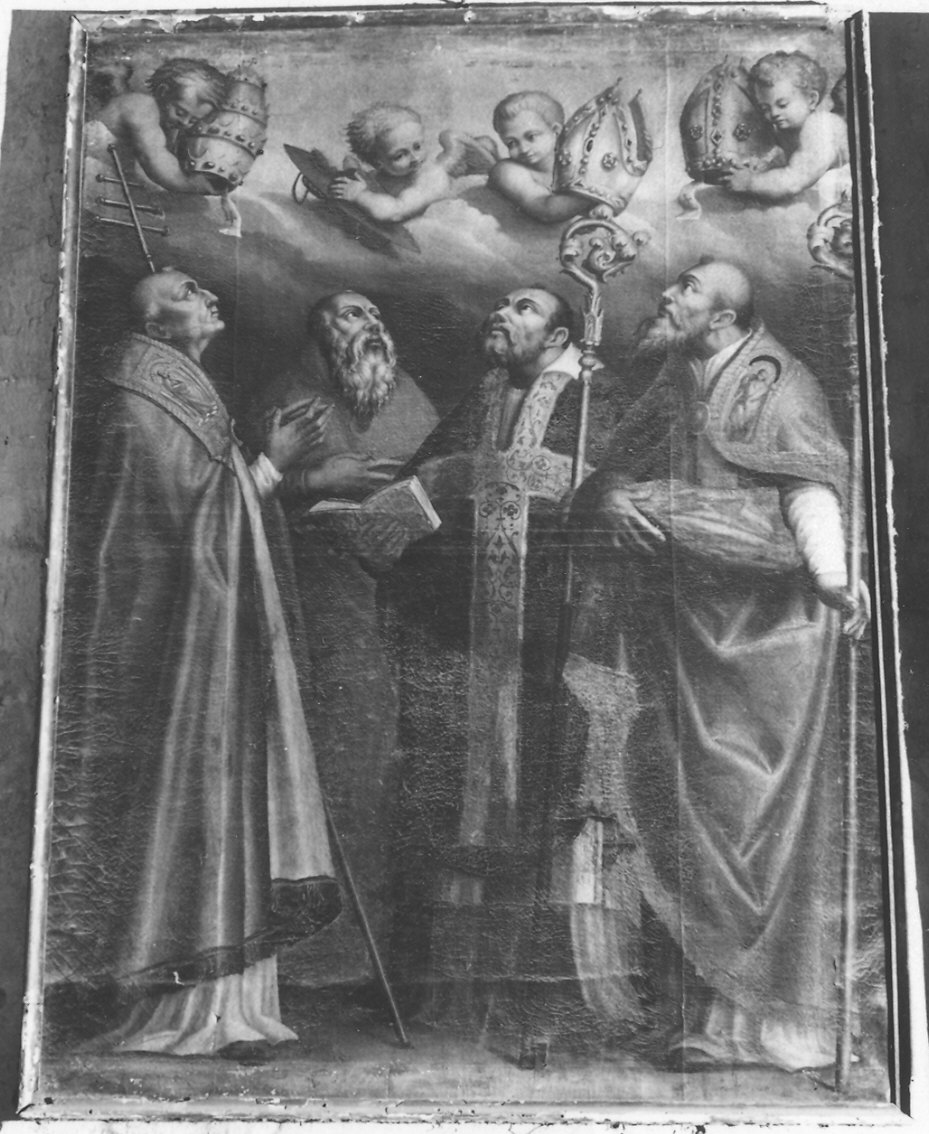 Da sinistra: San Leone Papa, con piviale giallo e bastone pontificio, con le mani giunte in preghiera mentre un angioletto tiene sospeso sopra il suo capo il triregno; San Gerolamo, con il rosso manto cardinalizio, guarda verso il cielo mentre un angioletto gli sostiene il galero; Sant'Ambrogio, in pianeta verde, regge il pastorale come pure Sant'Angostino, con piviale giallo: sopra di loro altri due angioletti tengono due mitrie riccamente ornate.