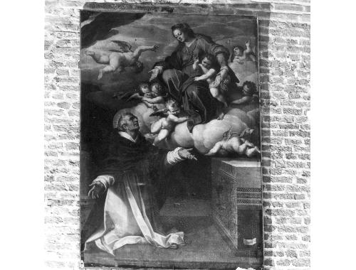 La Vergine, in veste rossa e manto blu, tenendo vicino a sé il Bambino, appare dall'alto di una nuvola, attorno alla quale giocano angioletti, a San Giacinto, inginocchiato davanti ad un altare; il bianco saio domenicano si "accartoccia" sulla predella. L'intonazione generale del dipinto è chiara e luminosa.
