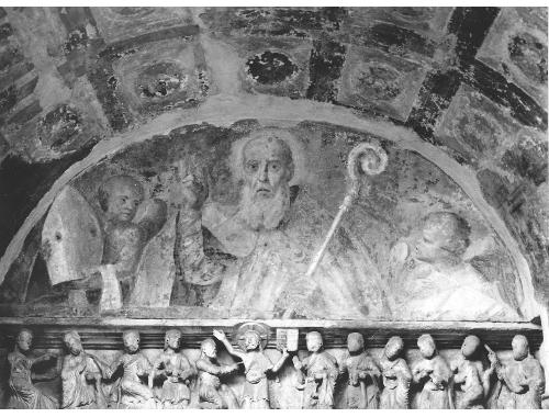Personaggi: Santo vescovo. Attributi: (Santo vescovo) pastorale; mitra; libro. Figure: angeli. Decorazioni: motivi decorativi a cassettoni con rosette