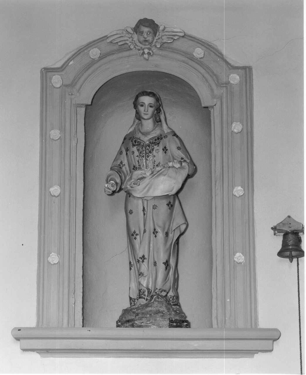 La santa, che porge una rosa con la mano destra e ne trattiene un mazzo con il braccio sinistro, veste un abito azzurro decorato con motivi dorati. Il velo è color giallo pallido.