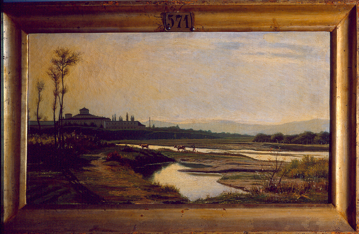 Paesaggi: greto del torrente Parma. Costruzioni: edificio urbano. Figure: contadino. Animali: bovini