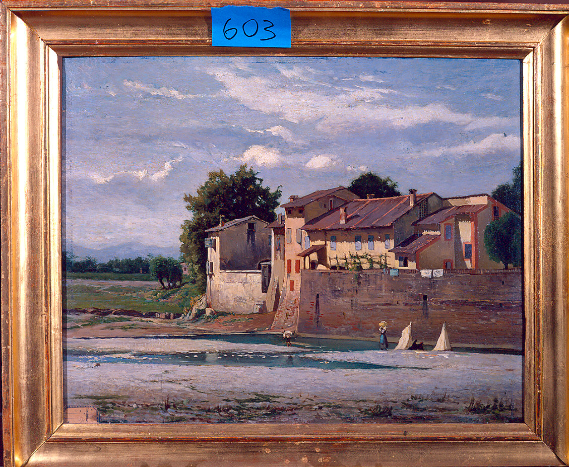 Vedute: torrente Parma. Costruzioni: case. Piante. Figure: lavandaie