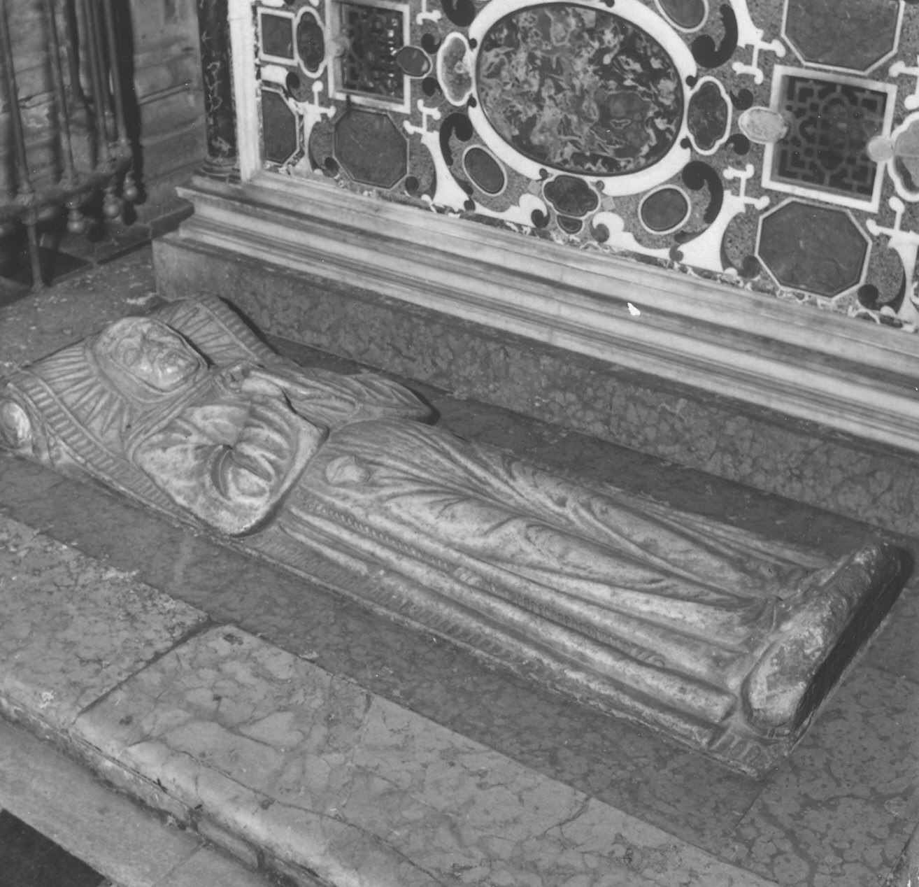 Il Beato Marco Fantuzzi, rivestito dell'abito francescano, è raffigurato coricato, con le mani giunte.