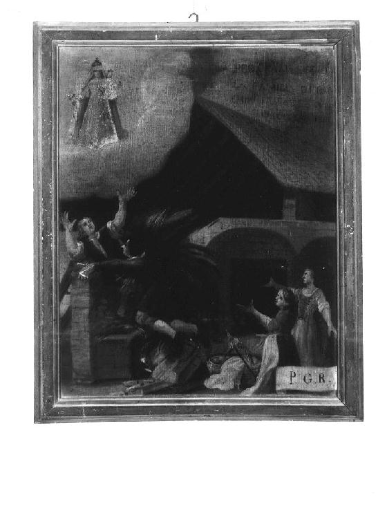 Madonna del Rosario appare mentre due uomini vengono travolti dal crollo di un fienile (ex voto dipinto)