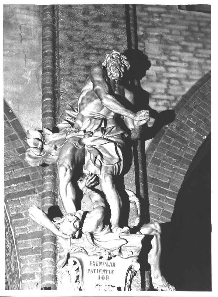 La statua poggia su di una mensola ad aggetto con sostegni a voluta che inscrivono un medaglione incorniciato di foglie d'acanto, con iscrizione esplicativa.. Personaggi: Giobbe; attributi: Satana schiacciato dal piede del profeta