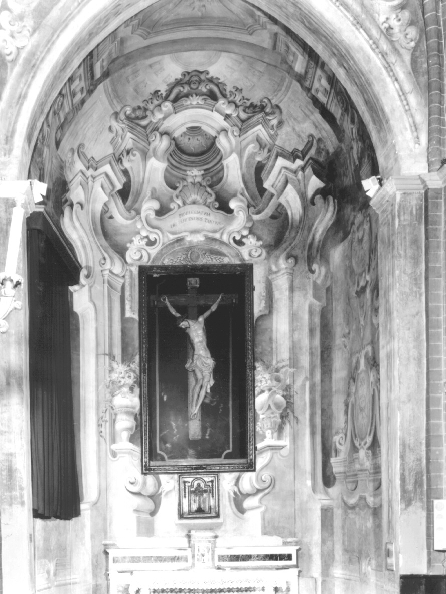 Decorazione a fresco quasi monocroma nei toni grigi e ocra chiari, con tocchi policromi e verdi nelle parti naturalistiche. Sul fondo dell'abside è un'ancona barocca a timpano spezzato definita da volute concavo-convesse, sulle cui ali laterali sono due vasi con anse antropomorfe ricolmi di fiori; sulla parete destra è un ovato coi simboli della Passione, decorato inferiormente da volute e superiormente da valva di conchiglia; nella semicupola cassettoni e decorazioni architettoniche a voluta. Sull'arco d'ingresso volute affiancano un cartiglio sagomato con iscrizione dedicatoria.