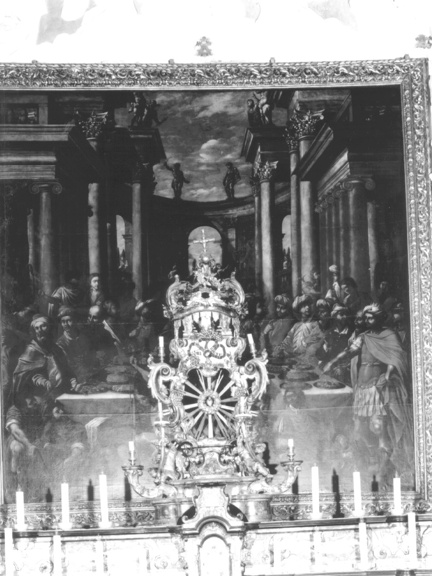 Dipinto. Personaggi: re; uomo senza veste nuziale; commensali; soldati. Architetture: colonne di quinta sfonfate da un esedra traforata da un arco e sormontate da una trabeazione con statue. Mobilia: tavolo a ferro di cavallo imbandito