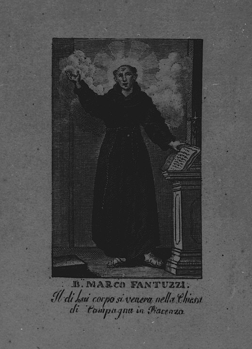 Personaggi: Beato Marco Fantuzzi. Abbigliamento: saio da francescano. Elementi architettonici: altare con crocefisso. Oggetti: libro. Fenomeni divini: nubi