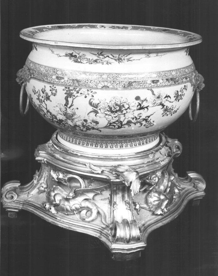 Base a sezione circolare. Corpo globulare con maniglie laterali ad anello applicate a testina zoomorfa. Apertura con bordo sporgente. Decorazione: motivi floreali policromi su fondo bianco; motivi a uncino.
