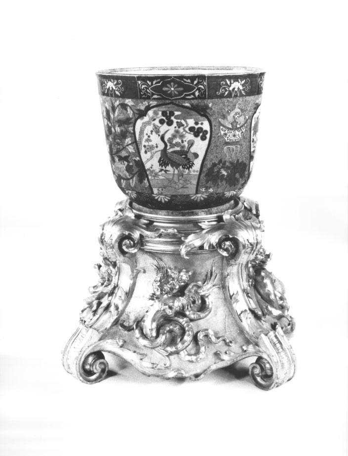 Vaso a base circolare appena svasata. Corpo a ciotola. Decorazione a motivi floreali minuti sulla fasce alla base e alla sommità; emblemi con animali, fiori e oggetti nel settore centrale.