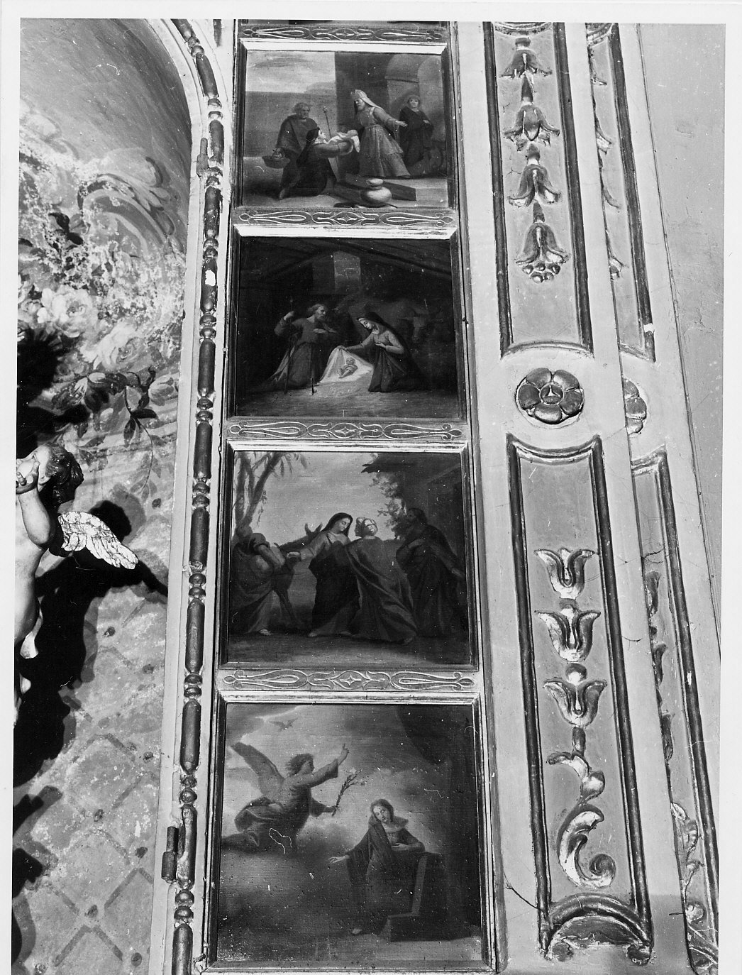 Le quindici scene rettangolari, raffiguranti i misteri Gaudiosi, Dolorosi e Gloriosi del Rosario, sono collegate da una cornice in legno dorato, incisa con piccole volute e foglie. Le figure si stagliano sul fondo bianco-giallo per le macchie di colore degli abiti ( rossi, blu, verdi).