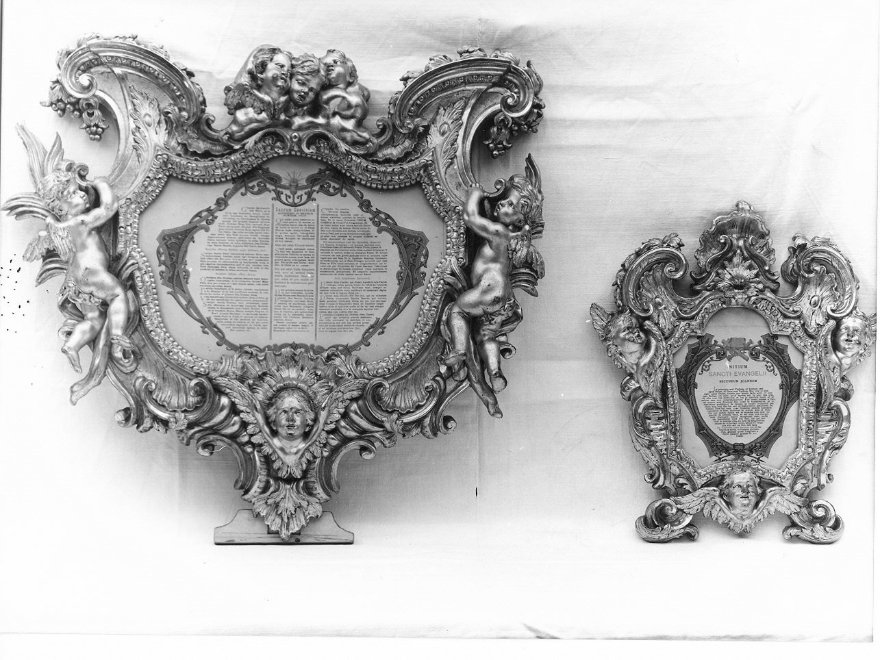 Il servizio presenta una ricca decorazione intagliata a forte rilievo; la cornice è profilata da una sottile perlinatura e da un motivo di fogliette finemente intagliate in modo naturalistico. Il bordo esterno è costituito da volute e controvolute con motivi vegetali. In alto, al centro, tre teste d'angelo, ai lat,i appesi alla voluta, grappoli d'uva; sui fianchi angioletto a tutto tondo, in atteggiamento di movimento con pannegggio svolazzante, in basso al centro testa d'angelo.